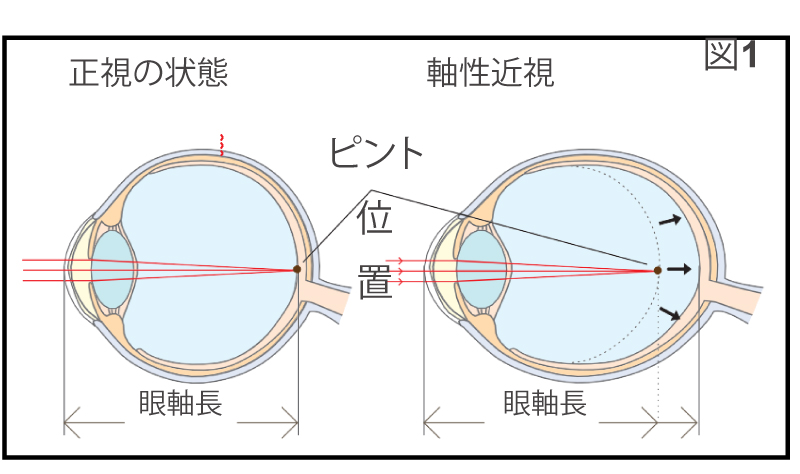 近視は眼球が楕円形に伸び(眼軸長が伸びる)ピントの位置がずれることで生じる軸性近視のケースが多く(図1)、一度眼軸が伸びてしまうと、戻ることがありません。 そのため、眼軸の伸びを抑えることが近視の進行を抑制するうえで重要です。