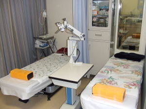 視力台は全4列で3列が0.9メートル、1列が5メートル視力台です。0.9メートル視力台は0.9メートルの距離で5メートル視力が測定できるようになっています。検査室では視力検査の他、屈折検査、眼圧検査、角膜内皮細胞測定、角膜形状解析検査、両眼視機能検査、色覚検査、動体視力検査、視力回復トレーニング(ワック)、眼鏡度数測定、緑内障スクリーニング検査(GDX)などを行っています。検査室には専属の眼科検査員が配属されていますが、受付などの常勤職員も勤続1年以上の職員は全員眼科検査員の資格を有しています。検査室の奥にはインフォームドコンセント用のスペースがあり、手術や予約検査の説明を患者様やご家族の方にパンフレットを供覧しながら、ゆっくり時間をかけてわかりやすく行えるようにしています。 |